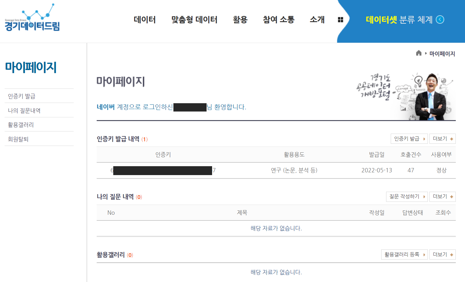 저는 '연구 (논문, 분석 등)'의 활용용도로 인증키를 아래와 같이 발급받았습니다.