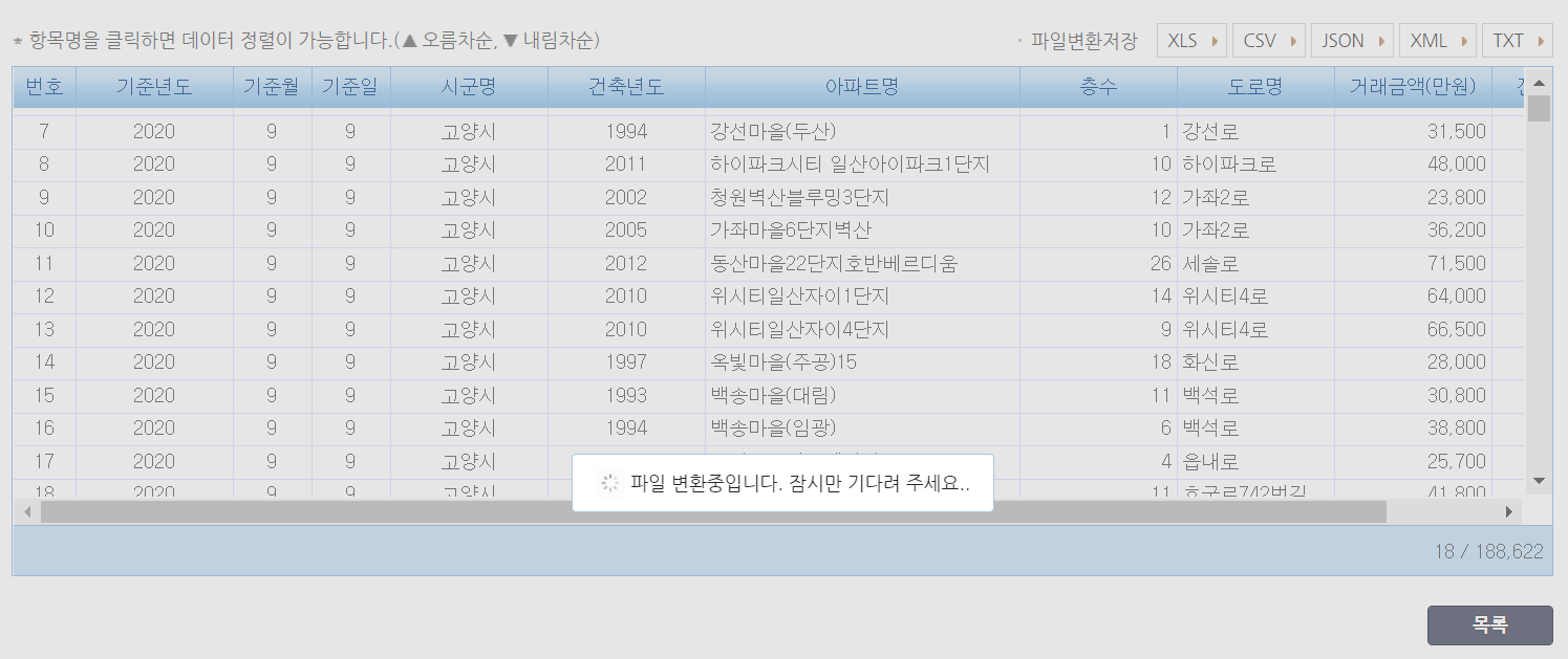 이 데이터는 웹사이트에서 xls, csv, json, xml, txt로 조회할 수 있습니다.