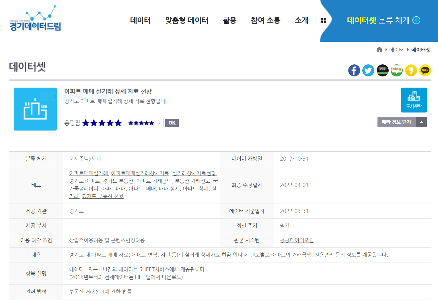 경기도청의 데이터정책과에서는 경기데이터드림 웹사이트를 통해서 경기도 아파트 매매 실거래 데이터를 제공합니다.