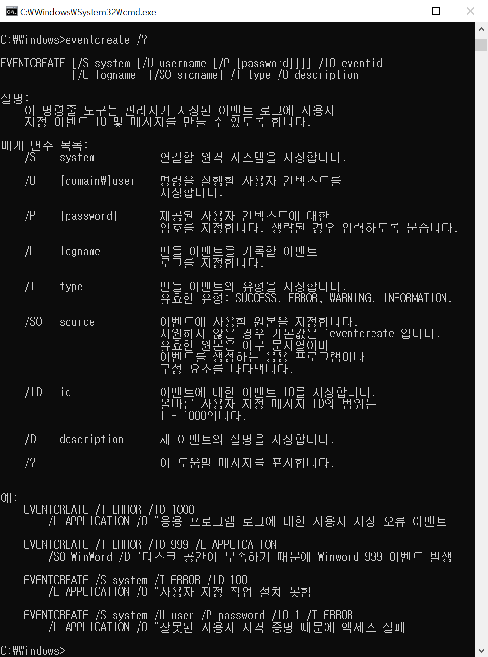다음은 cmd에서 확인한 eventcreate 사용법이다.