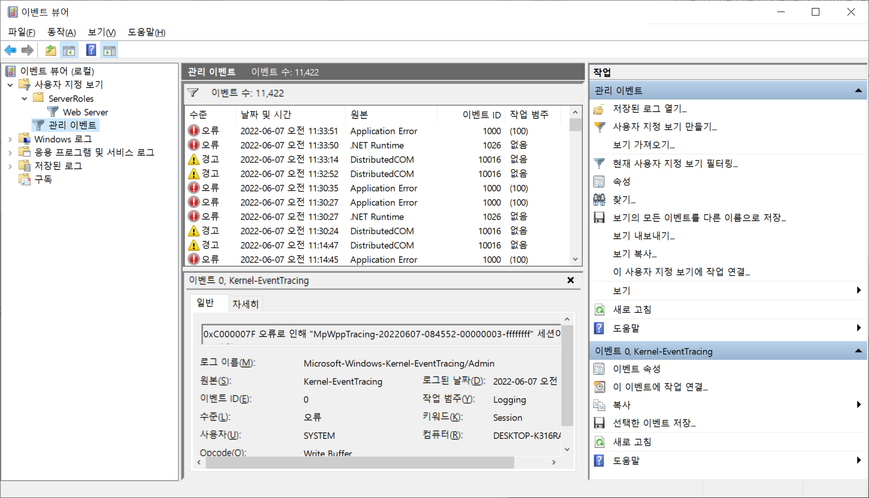 다음은 이벤트 뷰어 화면이다.