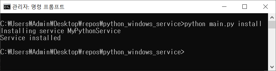 작성한 코드를 윈도우 서비스로 설치(등록)하려면 다음의 명령을 실행합니다.