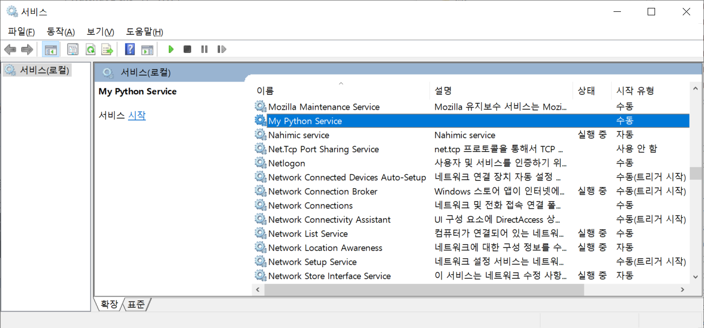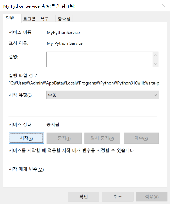 관리콘솔에서 "My Python Service"를 더블클릭하면 다음과 같은 윈도우가 나타납니다.