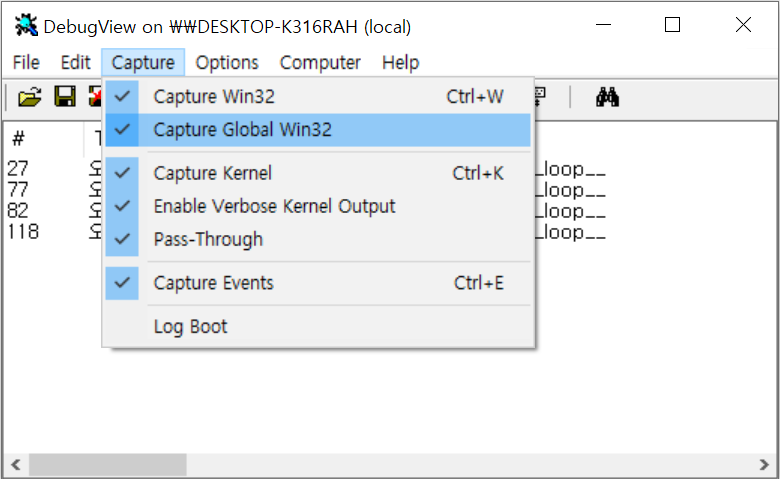 실행에 따른 디버그 메시지를 확인하려면 DebugView를 관리자권한으로 실행시킨 후,