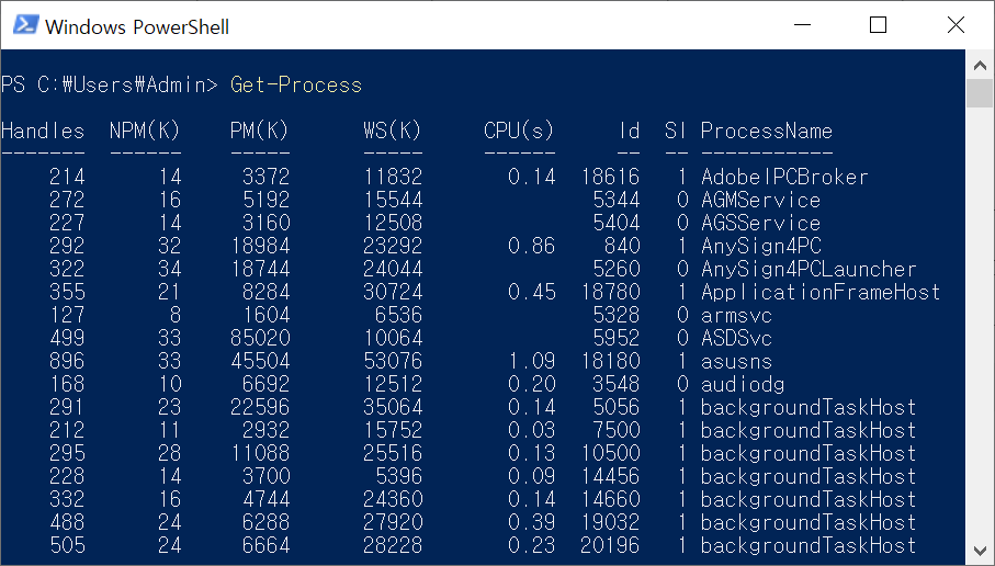 파워쉘에서 확인하는 방법은 Get-Process명령을 이용하면 됩니다. 실행화면 예시는 다음 그림과 같습니다.