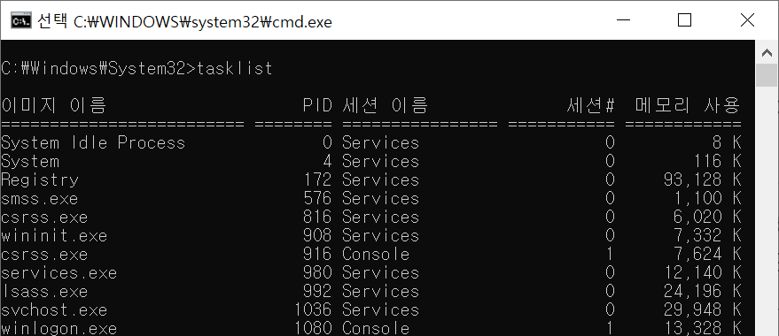 C:\Windows\System32\tasklist.exe를 실행하면 현재 실행 중인 프로세스의 목록을 확인할 수 있습니다.