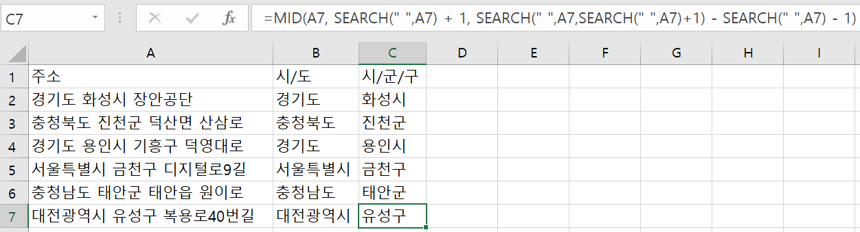 두번째 '시/군/구'를 추출하기 위해 사용한 수식은 좀 더 복잡합니다.