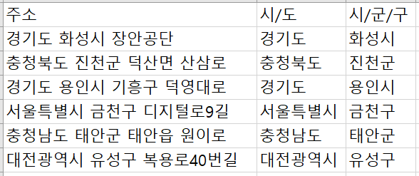 주소를 빈칸으로 구분하여 아래와 같이 나눌 때 사용할 수 있는 수식을 소개합니다.