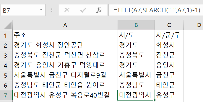LEFT함수와 SEARCH함수를 사용해서 아래 그림과 같이 '시/도'를 추출했습니다.