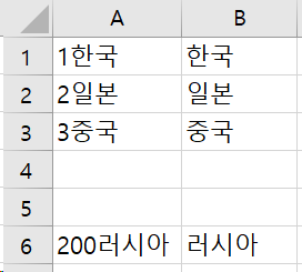 셀 A1에 '1한국'이 적혀있을 때 셀 B1에 다음 식을 적어 넣습니다.