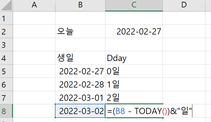 TODAY() 함수의 결과인 오늘이 "2022-02-27"이라고 했을 때,