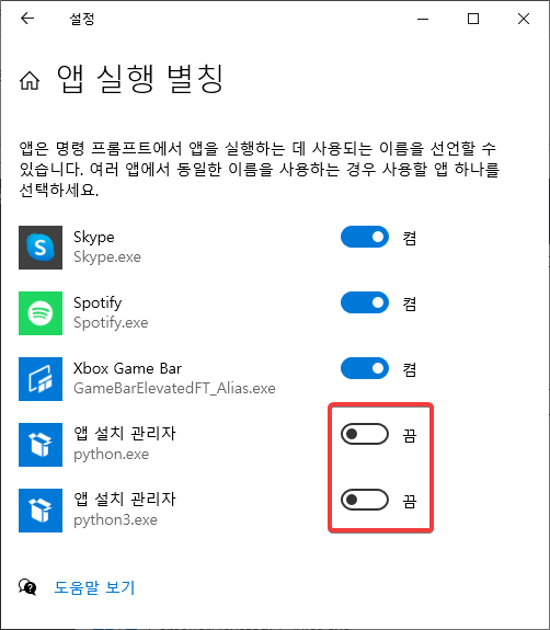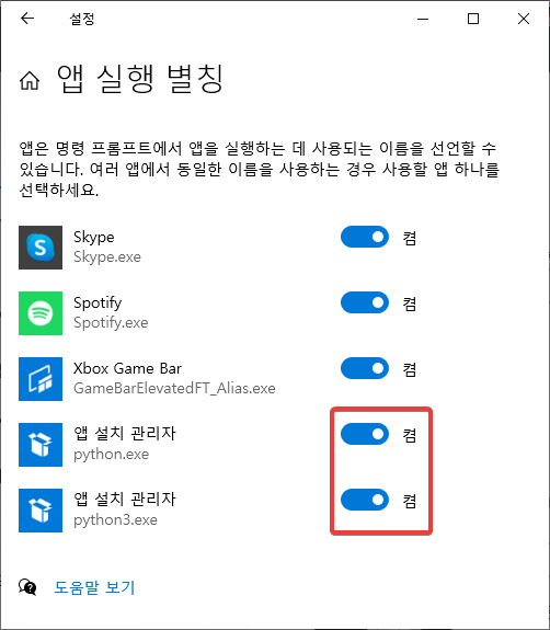 '앱 실행 별칭'에서 다음과 같이 앱 설치 관리자가 python.exe, python3.exe에 대해서 켜져 있습니다.