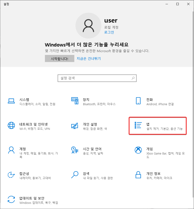 그럴 경우엔 설정 윈도우를 켜시고 '앱'을 선택합니다.