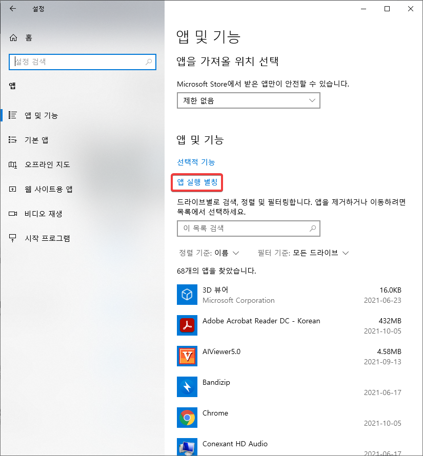 아래 그림과 같이 '앱 실행 별칭'을 선택해줍니다.