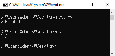설치가 잘 되었는지 node와 npm의 버전을 다음과 같이 확인해봅니다.