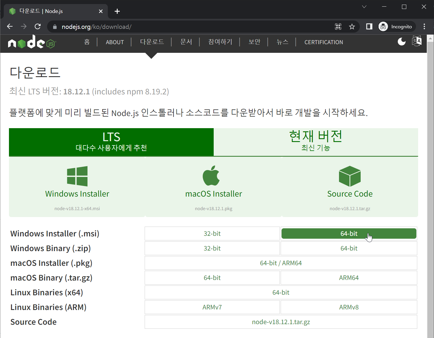 다음 주소에서 Node.js 인스톨러를 다운로드 받습니다.