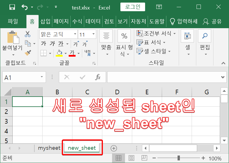 생성된 test.xlsx파일에서 sheet가 새로 생성됨을 확인할 수 있습니다.