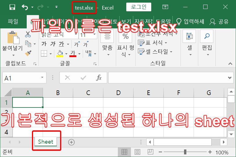 생성된 엑셀 파일은 기본적으로 하나의 sheet를 가집니다.