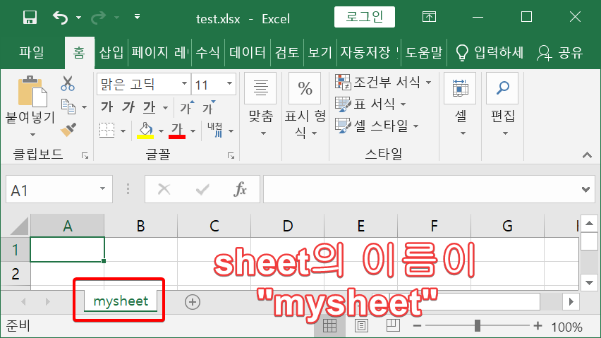 위의 예제를 실행하여 생성된 test.xlsx파일에서 sheet의 이름이 mysheet로 변경되었습니다.