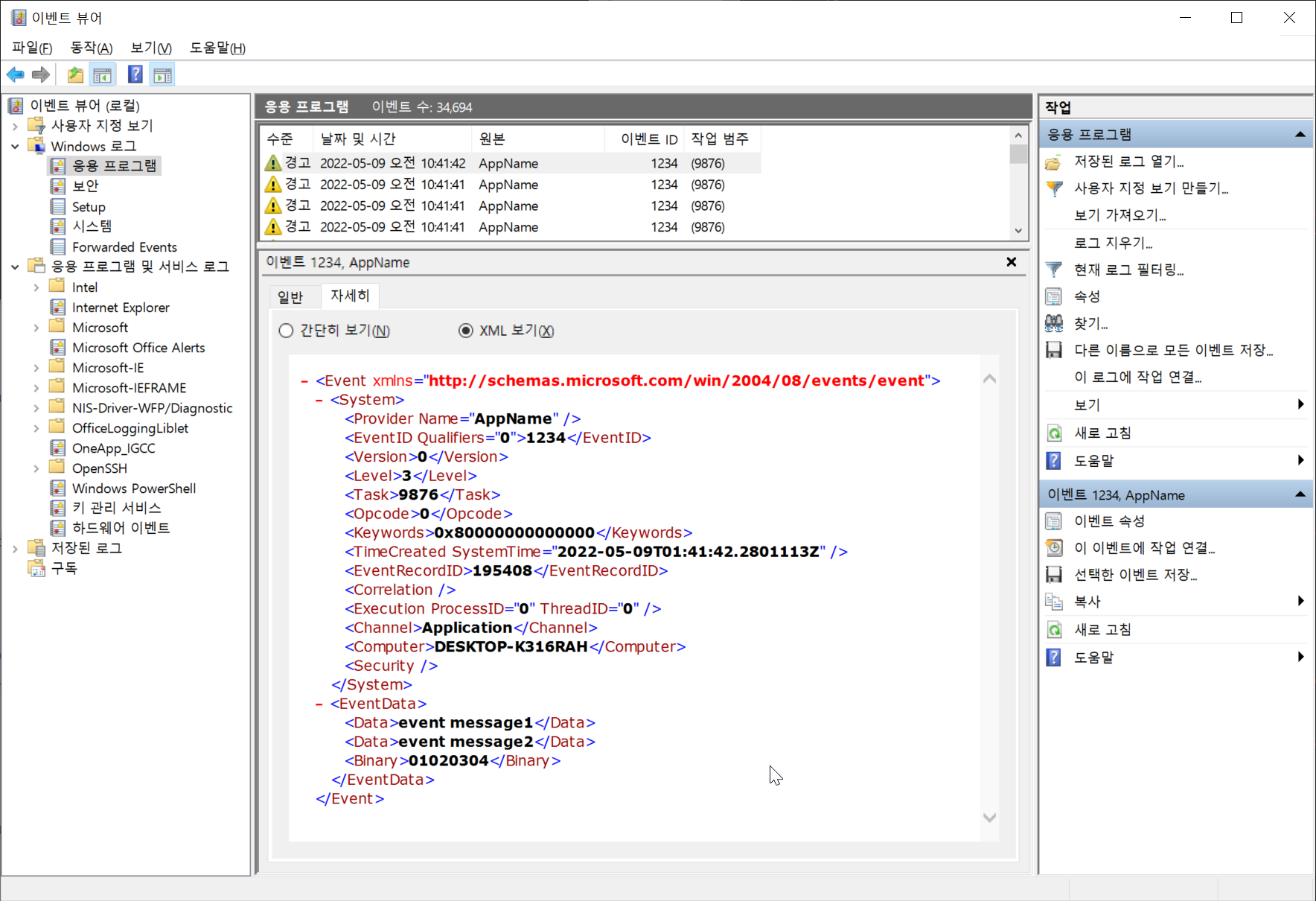 실행된 결과를 확인하기 위해 eventvwr.msc를 실행합니다.